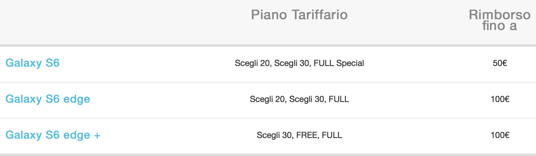 Iniziativa simile e per nulla distante nelle modalità di fruizione è proposta dall’operatore H3G, sotto il nome di “Samsung Galaxy S6 DAYS Christmas Edition“. Se acquisti uno smarTphone della serie Samsung Galaxy S6 con formula rateizzata e attivi un’offerta 3 Ricaricabile o Abbonamento, ricevi fino a 100€ di rimborso sul contributo iniziale versato. I piani tariffari aderenti all’iniziativa sono i seguenti: