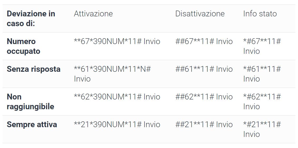 Nel caso in cui, invece, voleste modificare solo alcune delle numerose deviazioni di chiamata disponibili come ad esempio numero occupato, irraggiungibile, senza risposta ecc. dovrete utilizzare i codici riassunti qui, sempre da tastierino: