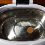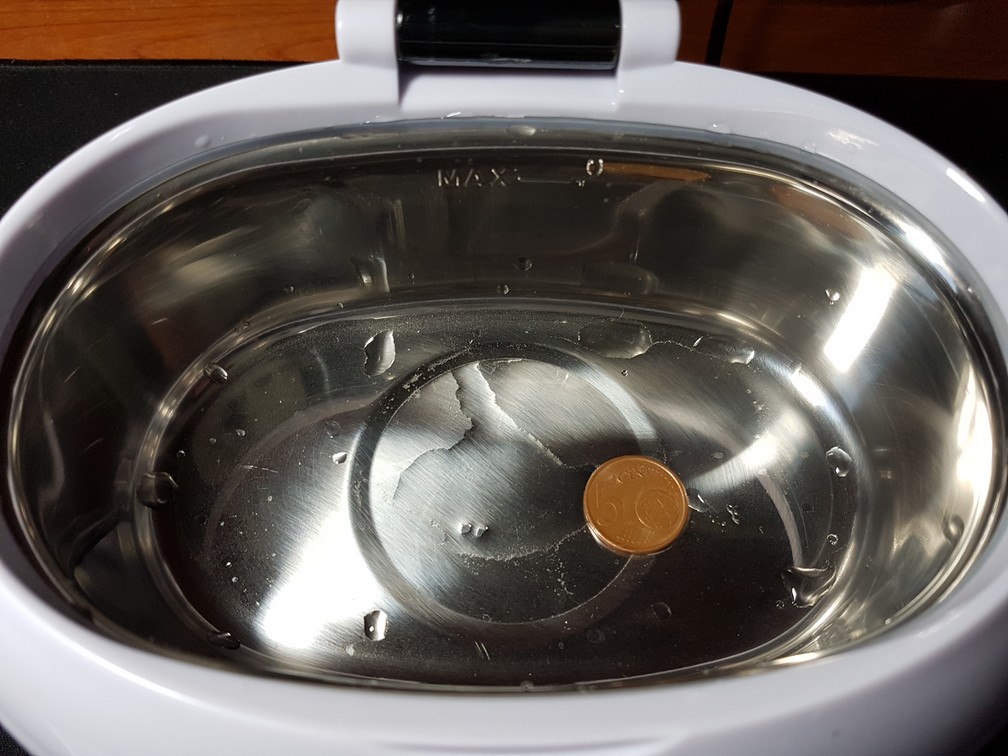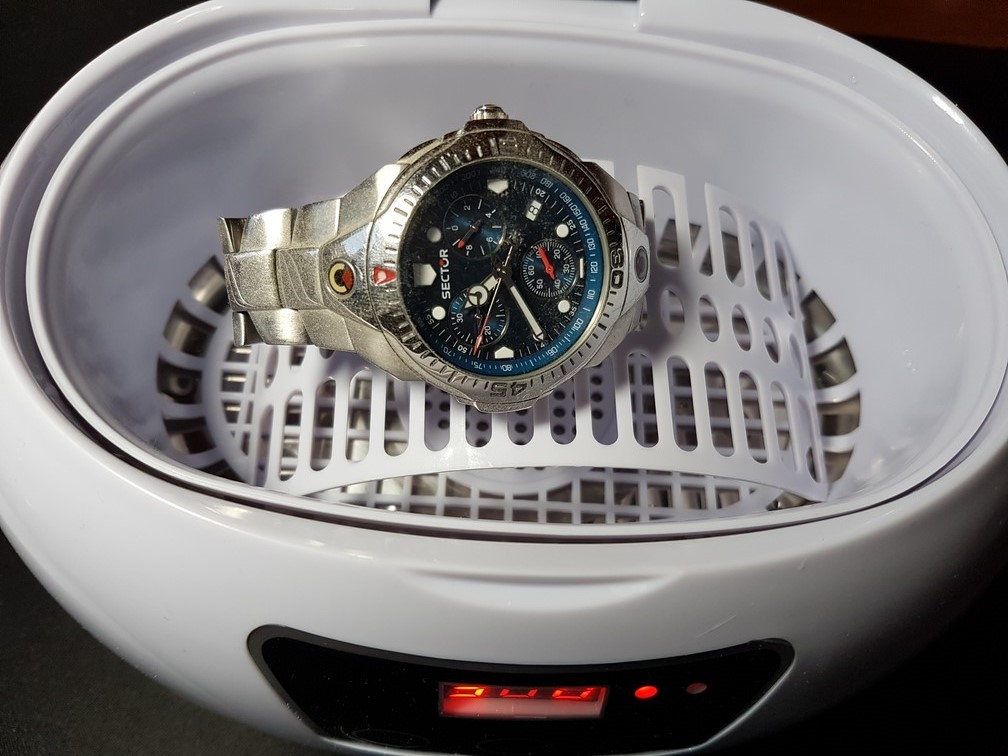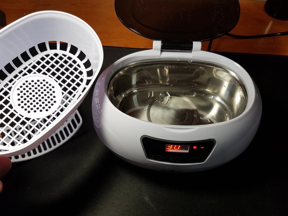 Dopo si avvia il ciclo di pulizia (da 90s a 30 minuti) e partono gli ultrasuoni a 42.000Hz. Abbiamo inserito delle monete da 5 cent per 30 minuti con acqua tiepida (che a fine ciclo era bollente!), le monte da ossidate come le vediamo di solito sono uscite belle lucide come appena prodotto. Utilissimo per pulire orologi e tutte le fessure. C’è pure un accessorio adatto allo scopo.