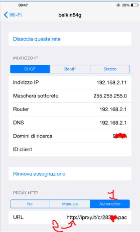 - Nella schermata che ci si presenterà, in basso, nella sezione PROXY HTTP selezionate “Automatico” e nel campo, scrivete quindi l’indirizzo che abbiamo evidenziato al primo punto. La configurazione della rete WiFi è ora terminata.
