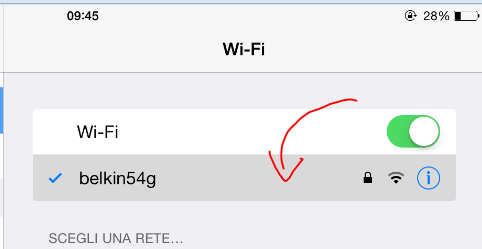 - Aprite le impostazioni del vosto iPad, collegatevi alla vostra rete WiFI, e cliccate sopra il suo nome, nel vostro caso ovviamente il nome del WiFi sarà differente.
