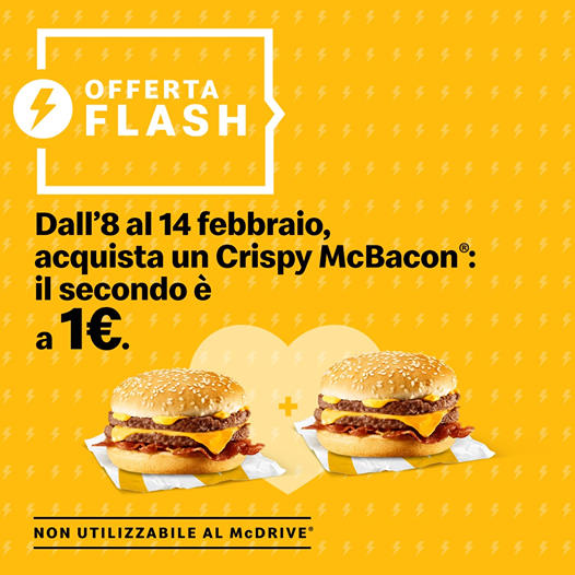 Una nuova promo lanciata dal McDonald’s vi permette di acquistare un Crispy McBacon a solo 1€ fino al 14 febbraio 2021. Tutti gli utenti che acquistano un Crispy Mc Bacon (a prezzo standard), potranno utilizzare il coupon (attivabile tramite app) per acquistare il secondo a 1€.