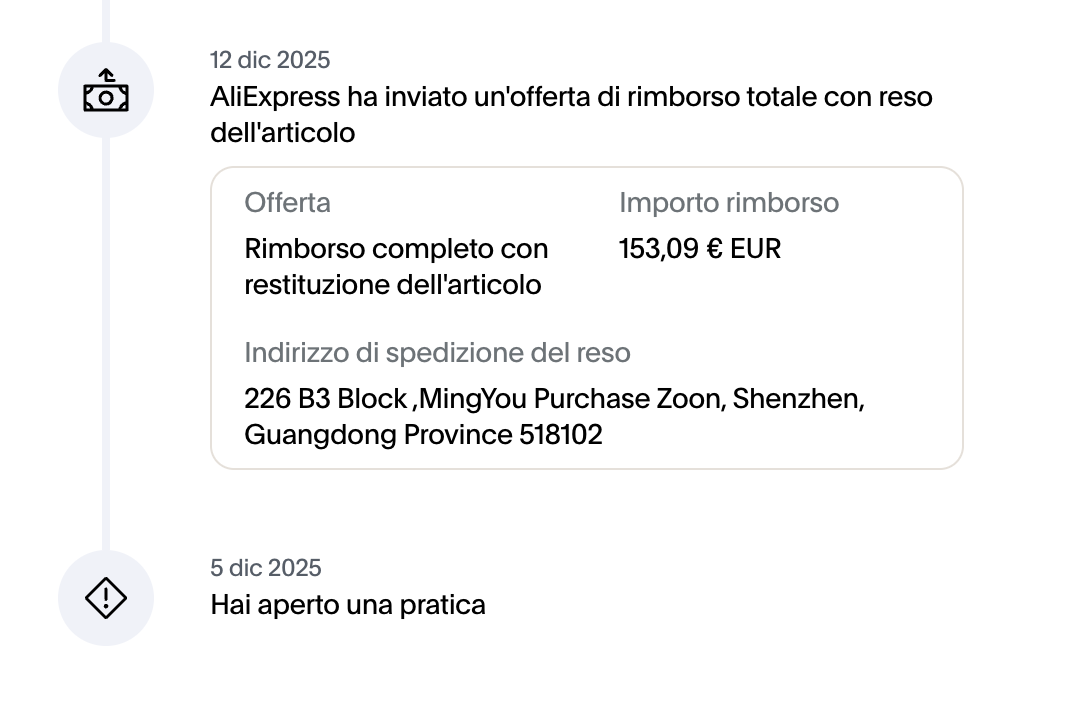 La vicenda si è finalmente conclusa oggi, con la conferma da parte di AliExpress che il caso è chiuso con ragione assegnata a noi e rimborso immediato.