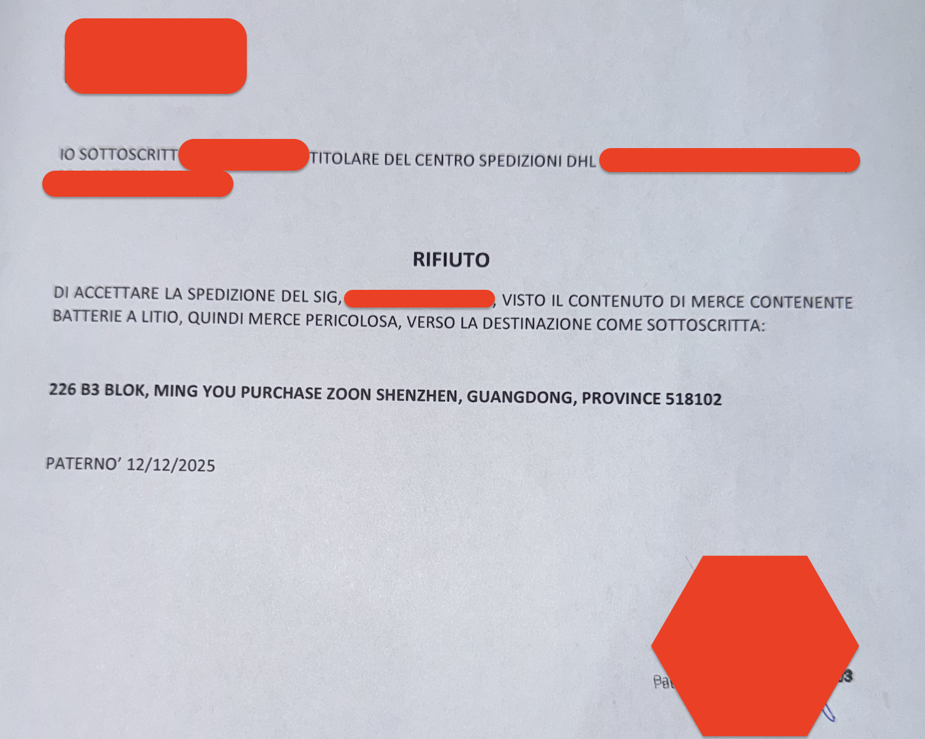 Il problema, oltre a dover pagare per un qualcosa di non ricevuto che è già pazzia, è che spedire batterie al litio da privati viola le norme IATA e nessun corriere accetta tale contenuto. Lo facciamo presente, PayPal ci chiede quindi una dichiarazione firmata e timbrata da un operatore postale e ci dicono di andare da Poste Italiane. Dopo aver visitato ben 3 uffici postali, con notevole perdita di tempo, nessuno ha voluto fornire nessuna dichiarazione scritta circa il non aver accettato la spedizione come ci si poteva immaginare.