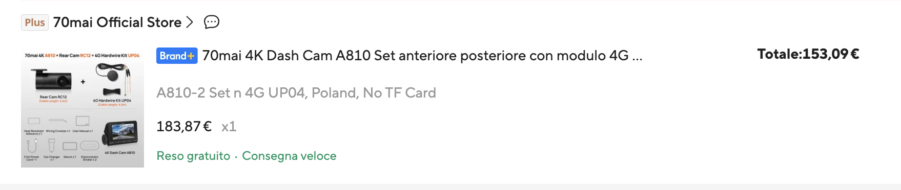 Ed è qui che inizia la nostra storia, con un nostro test effettuato proprio durante il Black Friday, giusto per capire la user experience. Acquistiamo una dashcam molto popolare dallo store ufficiale 70mai, la A810 4K con Kit 4G pagando tra coupon vari e sconti 153.09€ con PayPal. Circa 100€ in meno rispetto ad Amazon e la spedizione è veloce, con DHL.