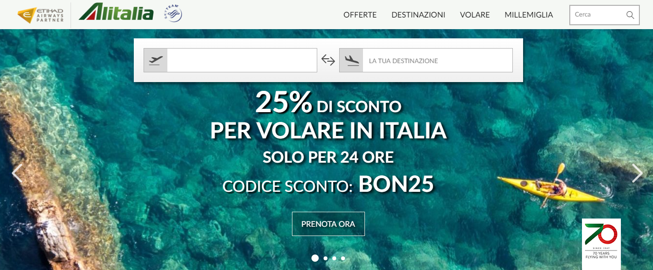 ATTENZIONE: vi ricordiamo che l’offerta è valida per acquisti effettuati su alitalia.com dalle 12:00 del 25 luglio alle 12:00 del 26 luglio 2017.