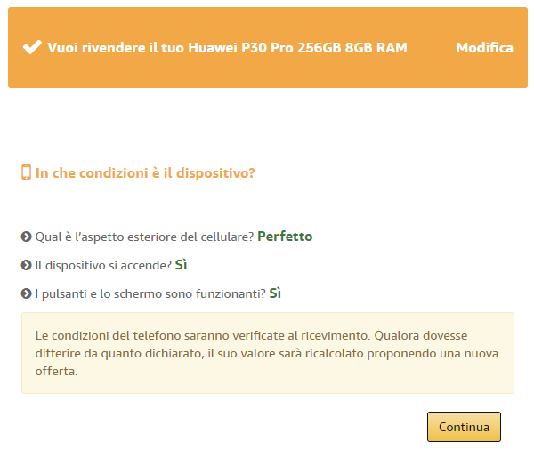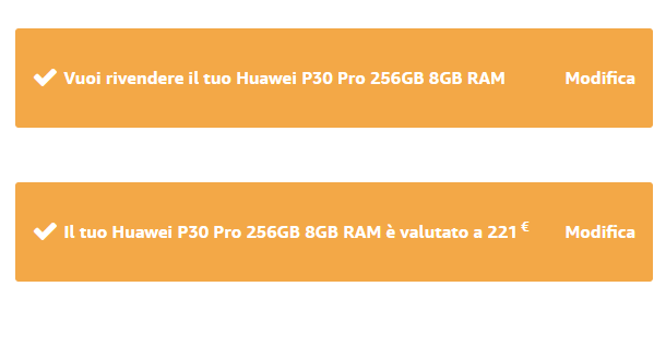 Abbiamo provato per voi il tool messo a disposizione da Amazon Recommerce, usando a titolo d’esempio un Huawei P30 Pro da 8 GB di RAM e 256 GB di memoria interna, ottenendo una valutazione di 221 euro.