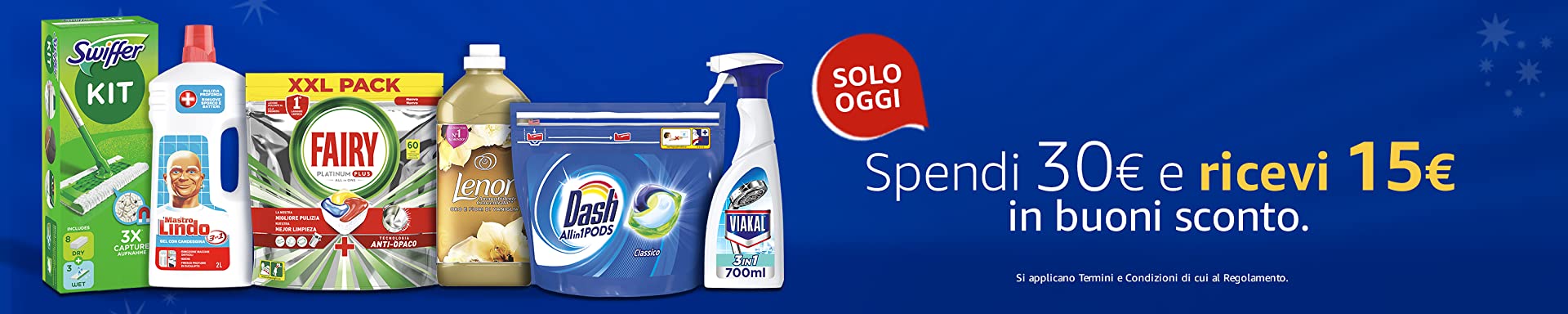 Amazon torna alla carica con una nuova promozione molto interessante che vi regala subito ben 15€. Questa volta è dedicata tutta al mondo del pulito, ed infatti, abbiamo in offerta tantissimi prodotti di marchi piuttosto famosi. Parliamo di Dash, Swiffer, Lenor, Viakal, Fairy, Mastro Lindo  ed altri ancora.