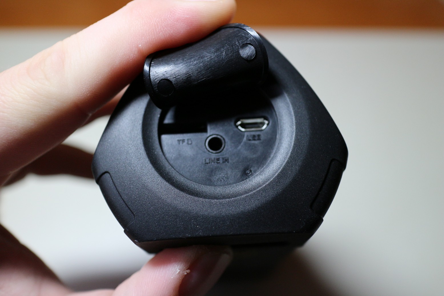 COSTRUZIONE Dimensioni 16,5 x 6,6 x 5,8 cm e meno di 400g di peso lo rendono tutto sommato maneggevole ma quello che più salta all’occhio è il rivestimento quasi a corazza di gomma: è tutto protetto da polvere e schizzi d’acqua, comprese le connessioni laterali che comprendono, micro USB per la ricarica della batteria integrata da 2200 mAh che garantisce 12 ore di musica, Micro SD e presa AUX. Sul frontale 2 altoparlanti stereo da 5W ciascuno. Curioso l’aggancio per un moschettone da cantiere quasi.