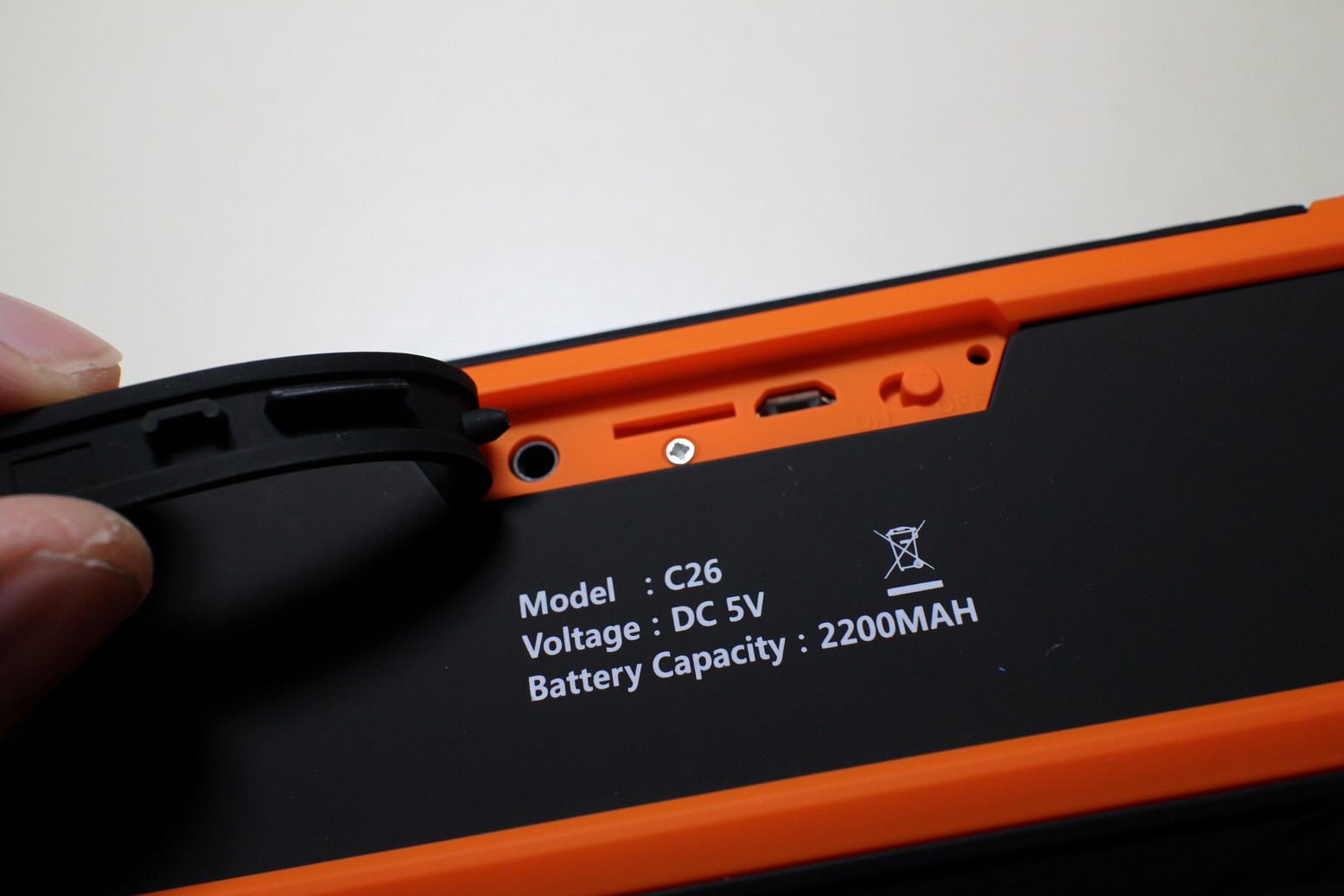 COSTRUZIONE Dimensioni 18,5 x 5,6 x 5,1 cm e 400g di peso lo rendono tutto sommato maneggevole ma quello che più salta all’occhio è il rivestimento quasi a corazza di gomma: è tutto protetto da polvere e schizzi d’acqua, comprese le connessioni posteriori che comprendono tasto accensione, micro USB per la ricarica della batteria integrata da 2200 mAh e presa AUX. Sul frontale 2 altoparlanti stereo da 5W ciascuno. Curioso il flash LED su uno speaker attivabile tramite i tasti superiori (volume, cambio traccia, play/pausa, LED e risposta chiamate) e l’aggancio per un moschettone da cantiere quasi.