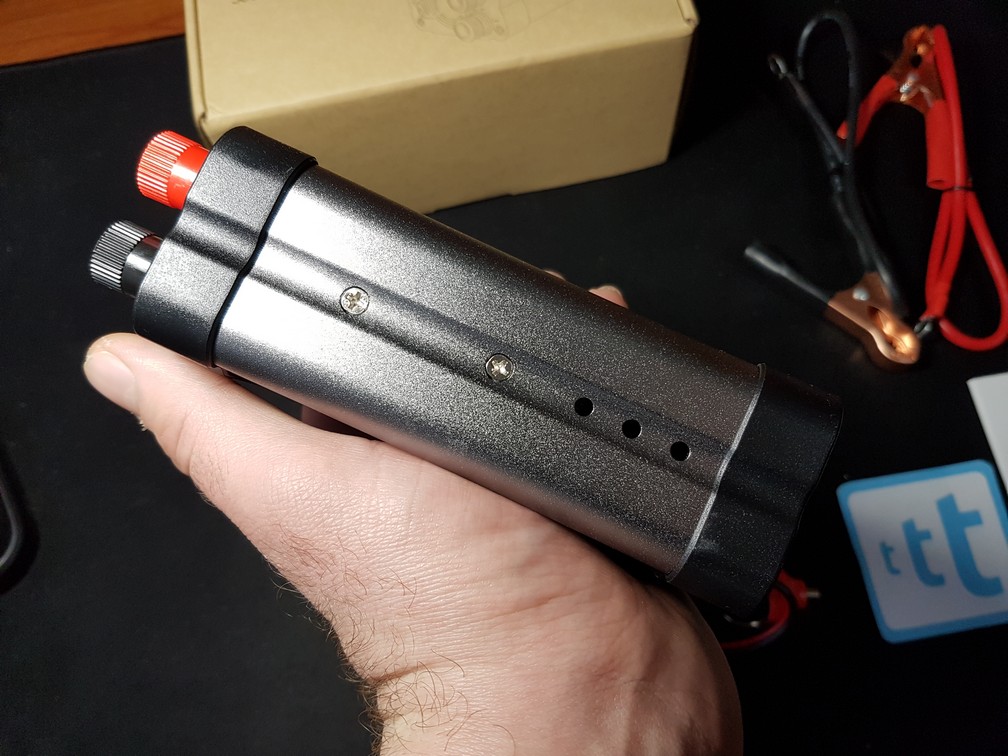 COSTRUZIONE Ha una forma molto a lattina il che lo rende compatto e ben impugnabile: si nota subito una buona qualità costruttiva ed il cavo per la presa accendisigari lungo e ben robusto. Importante presenza anche la ventolina inferiore che garantisce il raffreddamento del prodotto evitandone rotture.