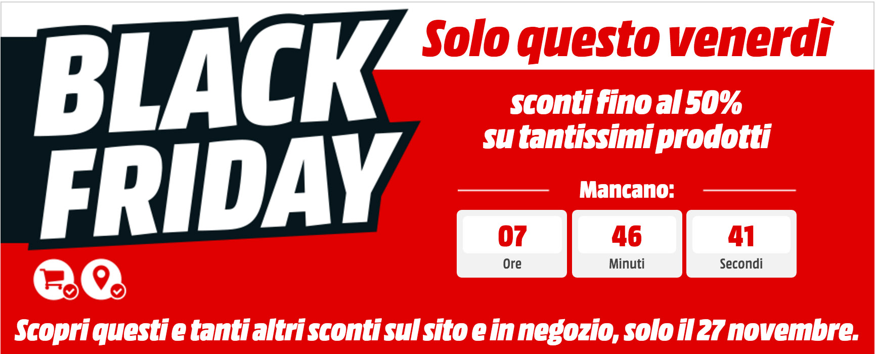 MediaWorld caratterizzerà il proprio Black Friday con sconti interessanti, fino al 50%: l’iniziativa sarà, ovviamente, valida soltanto domani venerdì 27 Novembre. E’ importante arrivare primi poichè i prodotti scontati saranno disponibili fino ad esaurimento scorte. Ottima occasione per fare regali in vista del Natale.