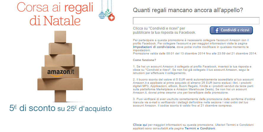 Sempre più italiani scelgono gli store online per gli acquisti natalizi sia per la maggior comodità nella scelta sia, soprattutto, per l’enorme convenienza e i forti sconti che solitamente ci sono in quest’ultimi. Non fa eccezione uno dei più famosi store online del mondo, Amazon, che dal 13 dicembre fino al 21 dicembre (compreso) permette di ricevere un buono sconto di 5 € su una spesa minima di 25€.