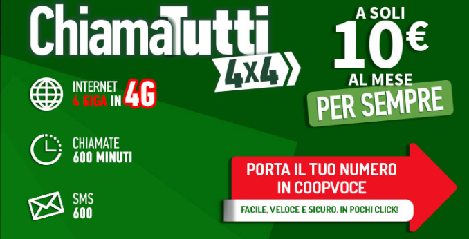 Novità in casa CoopVoce, operatore virtuale su rete TIM che finalmente vede la possibilità di usare le moderni reti 4G e lo fa con un’offerta veramente interessante denominata ChiamaTutti 4×4. L’offerta offre 600 minuti di chiamate verso tutti, 600 SMS e ben 4GB in 4G a 10€ al mese (mese vero).