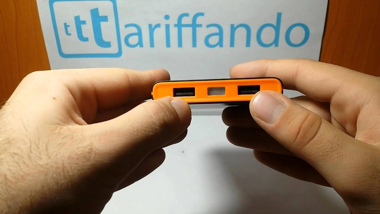 COSTRUZIONE Ha dimensioni compatte per la grandissima capacità offerta, pari a ben 10.000 mAh: 14,4 x 7,5 x 1,5 cm e pesa poco, solo 227g, ma quello che più ci piace è la costruzione, è infatti realizzata in plastica di ottima qualità (sembra quasi metallo) e ha un frame colorato, nel nostro caso arancione, che da davvero un tocco di design in più! Presenti 2 USB da 2.4A ciascuno, con tecnologia Smart e tutte le protezioni contro sovraccarichi e corto circuiti. La carica rimanente si verifica grazie a 4 LED attivabili con una pressione dell’unico tasto presente, una doppia pressione attiverà la torcia al LED, molto luminosa!
