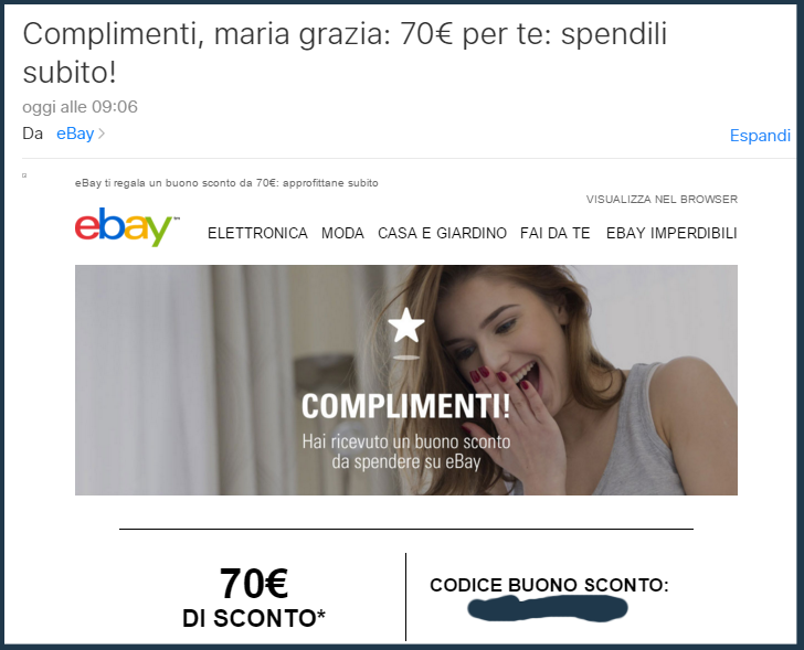 eBay invia ai suoi utenti un buono omaggio da ben 70€ ma i codici non funzionano e su Facebook l’azienda dichiara “E’ stato uno sbaglio”