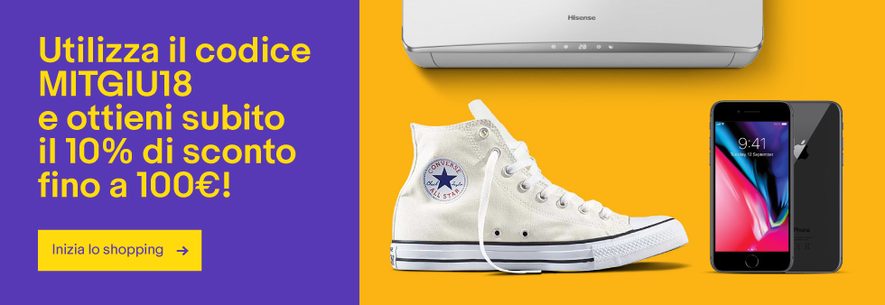L’ offerta, tramite l’ utilizzo di un codice sconto permette quindi di ottenere uno sconto del 10% su tutti i prodotti, escluse le eventuali spese di spedizione. Il codice è utilizzabile solo una volta per utente, entro il 13 Giugno 2018 ed offre uno sconto massimo pari a 100€ – inoltre l’ uso del codice è riservato a chi paga con PayPal (metodo di pagamento migliore da usare su eBay) e spende almeno 30€.