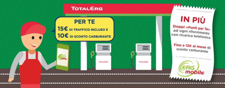 Attivando una nuova SIM ERG Mobile entro il 31 agosto 2017 si ha diritto a 10€ di sconto carburante presso le stazioni di servizio TotalERG aderenti.