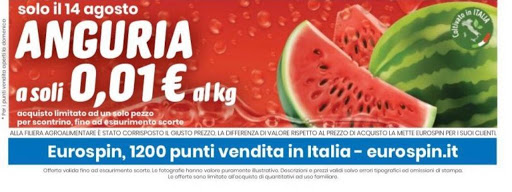 Eurospin ha avviato una grande promozione per la giornata del 14 agosto 2020 rendendo disponibile una singola anguria al prezzo di un centesimo al chilogrammo