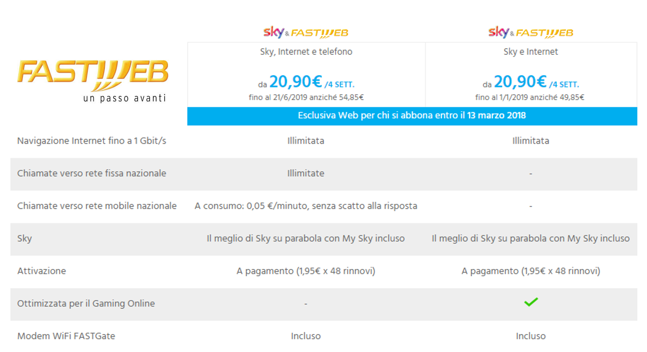 - Fibra Ottica e ADSL: Sky, Internet, telefonate illimitate verso fisso da 20,90€ /4 SETT. fino al 21/6/2019 anziché 54,85€;