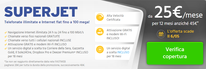 Per verificare la copertura della tua zona e ottenere più chiarimenti, visita la pagina dedicata all’offerta SUPERJET di Fastweb.