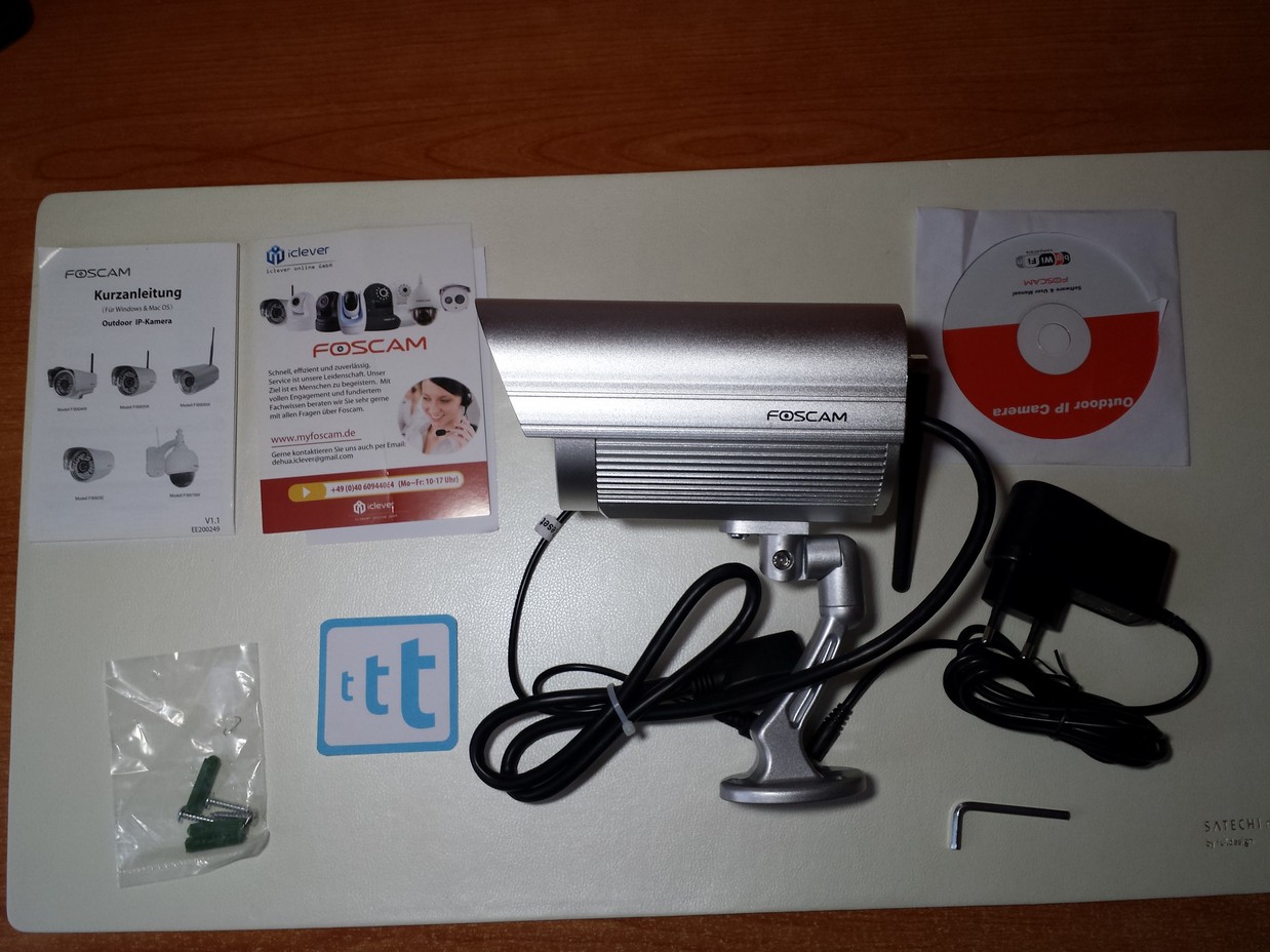 CONFEZIONE La confezione della Foscam FI8905W è ben realizzata con tanta protezione in polistirolo dentro, e al suo interno nasconde oltre alla IP Camera numerosi accessori: 1 Cavo LAN rj45, 1 Staffa per fissaggio a muro con relativi tasselli, l’ antenna WiFI da collegare alla camera, una chiavetta per stringere le viti della staffa, l’alimentatore e infine la manualistica (solo in Tedesco!) con un CD relativamente utile.