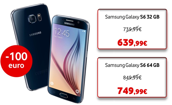 Il campione di vendite e incassi Samsung Galaxy S6 continua a scendere di prezzo: dopo le importanti scontistiche riservate da Vodafone a molti clienti che permettevano di acquistarlo a rate, con un prezzo ribassato e senza alcun vincolo, di cui abbiamo parlato qui e qui, la notizia di oggi è che non è più necessaria la carta di credito. Adesso Galaxy S6 viene scontato a tutti coloro che lo pagano in contanti. Previsto un ulteriore sconto per i fortunati che riceveranno un SMS di invito da Vodafone stessa.