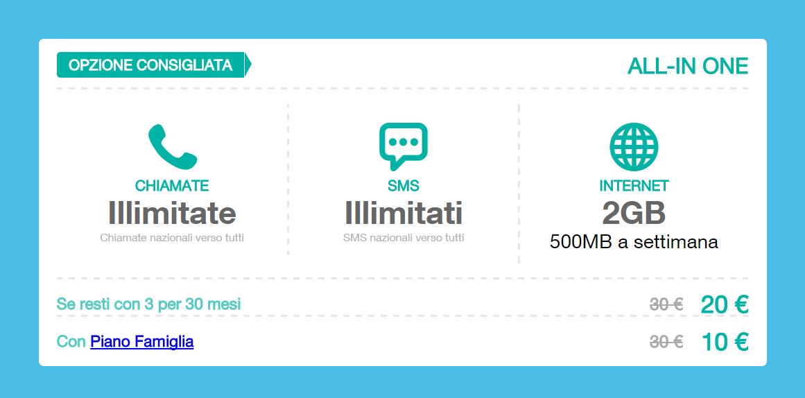 In questo caso ci riferiamo alle opzioni ALL IN ONE a 10€ mensili, che ricordiamo includono:
