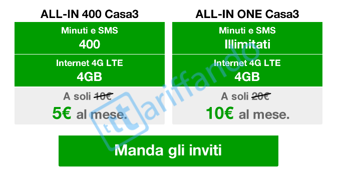 ALL-IN 400 prevede: 400 minuti, 400 SMS verso tutti e 4GB di internet (4G LTE) a 5€ anziché 10€. ALL-IN One prevede: minuti e SMS illimitati verso tutti, 4GB di internet (4GB LTE) a 10€ al mese anziché 20€. Per poter attivare le due tariffe telefoniche ai seguenti prezzi è necessario attivare il piano Casa 3, inoltre le due promozioni da noi elencate sono attivabili in 3 SIM differenti. Per attivare una delle due offerte mobile nelle tre SIM basterà mandare gli inviti dal sito ufficiale dell’operatore.