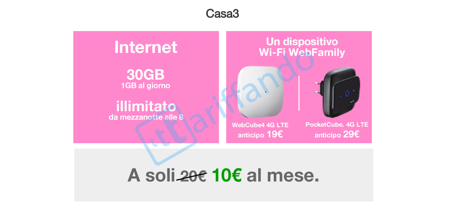 Il seguente piano resta invariato, e prevede 1 GB di traffico dati, e da mezzanotte fino alle 8 traffico illimitato. Per usufruire della seguente promozione è necessario acquistare uno dei dispositivi WebFamily: WebCube 4 con anticipo di 19€ e PocketCube con anticipo di 29€, entrambi 4G LTE. Per quanto riguarda le tariffe mobile è possibile abbinare la ALL-IN 400 Casa 3 e la ALL-IN ONE.