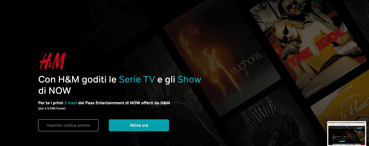 Articolo molto breve per informarvi circa la possibilità di ricevere 2 mesi gratis di NOW con Pass Intrattenimento grazie al popolare brand d’abbigliamento H&M.