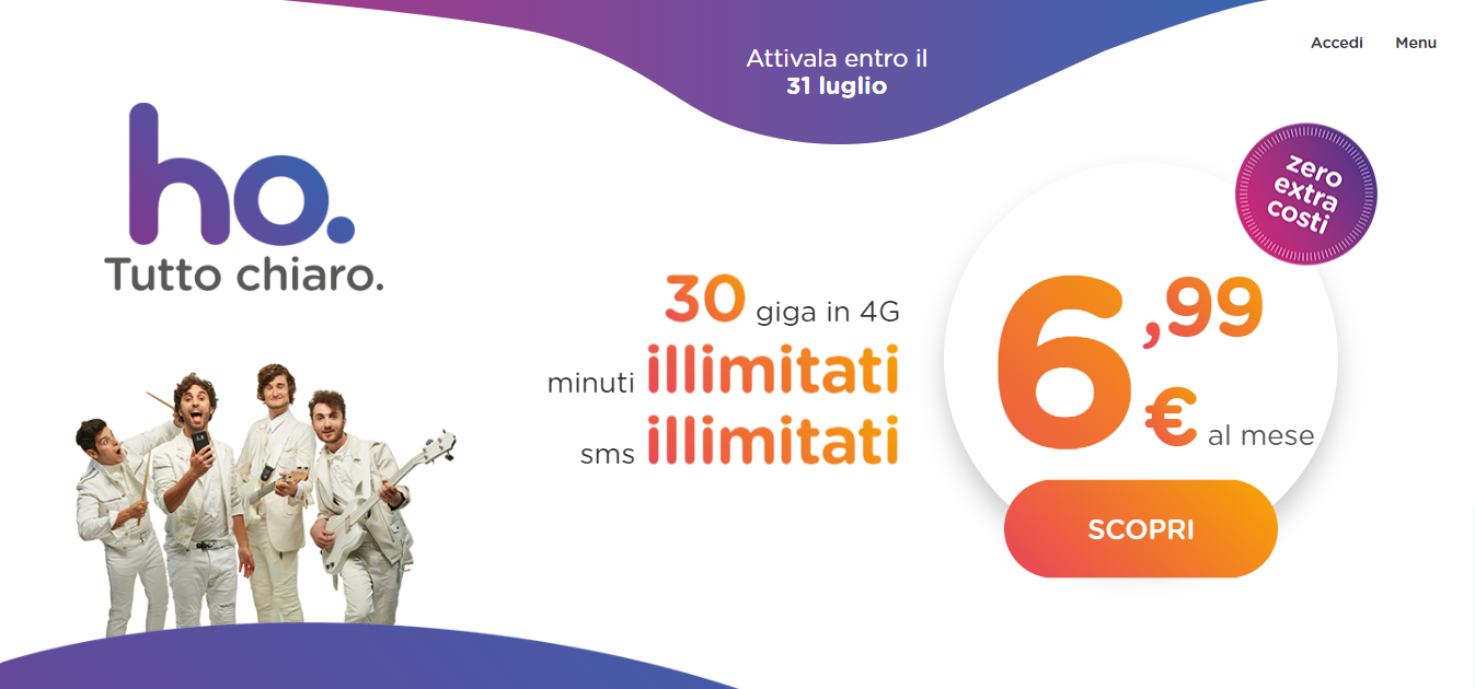 Anche nel caso di ho. Mobile, come per iliad, la tariffa è unica, e anche pressoché identica: Minuti ed SMS illimitati verso tutti e 30GB in 4G+ a 6,99€ – per cui, 1€ in più rispetto ad iliad. Sono inoltre previsti 2GB da utilizzare in Europa come bonus dati a parte, per ogni mese.