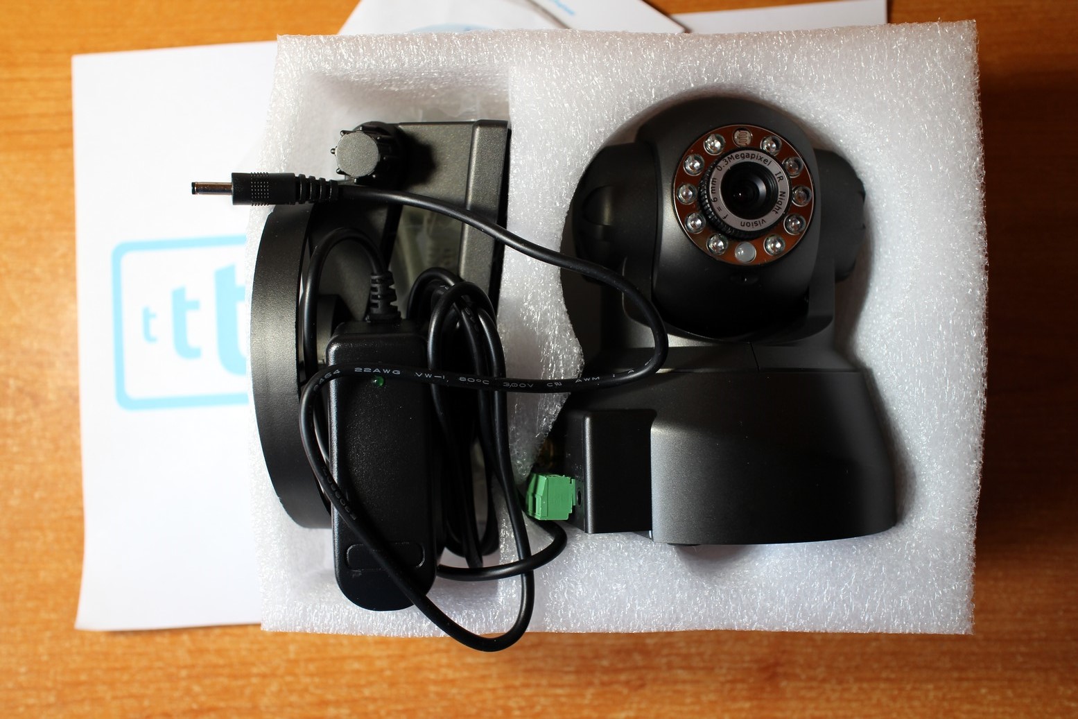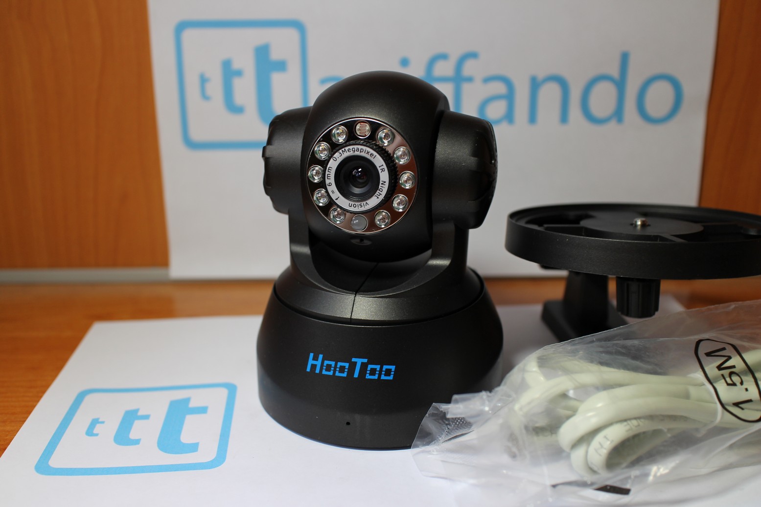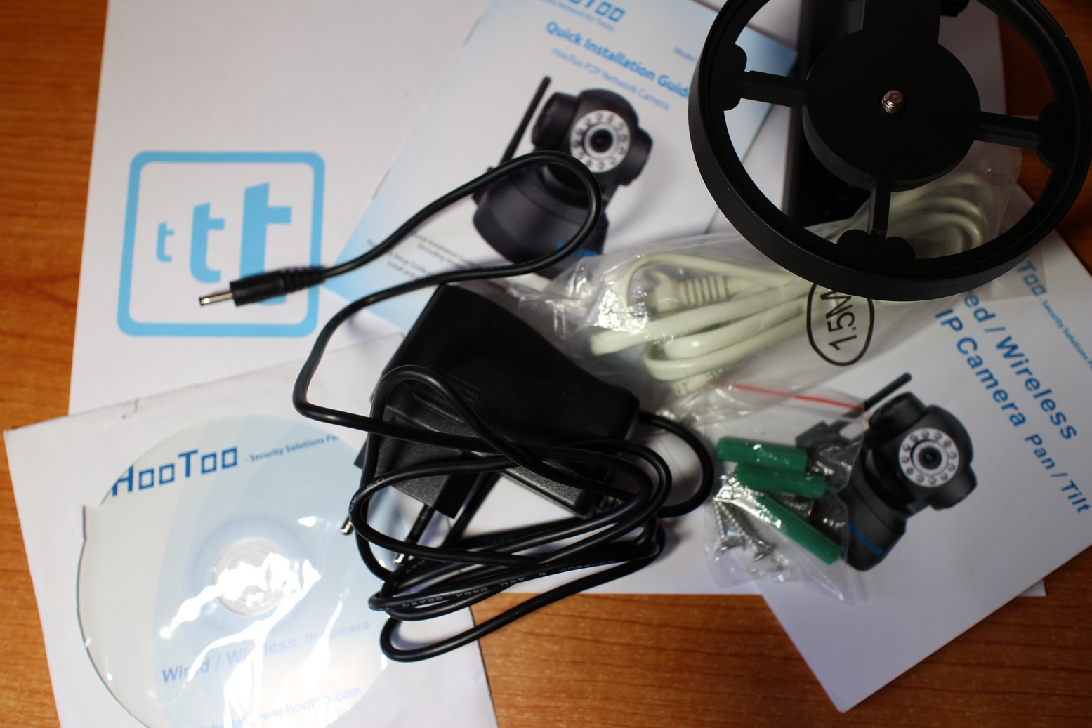 CONFEZIONE La confezione della HooToo HT-IP206 è ben realizzata con tanta protezione in polistirolo dentro, e al suo interno nasconde oltre alla IP Camera numerosi accessori: 1 Cavo LAN rj45, 1 Staffa per eventuale fissaggio a muro con relativi tasselli, l’ antenna WiFI da collegare alla camera, e infine la manualistica (molto confusa e poco aggiornata, indica app non più esistenti) e un CD relativamente utile.