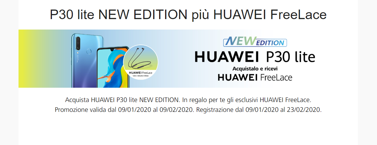Chi acquisterà il P30 Lite dal 9 gennaio al 9 febbraio nei punti vendita o nei siti e-commerce aderenti dovrà registrarsi entro e non oltre il 23 febbraio sul sito dedicato alla promo; successivamente verrà chiesto di caricare la scansione della prova di acquisto (scontrino fiscale, ricevuta o fattura con data e indicazione chiara del modello acquistato) riportante una data compresa esclusivamente tra il 09/01/2020 e il 09/02/2020; si precisa che in caso di acquisti effettuati attraverso Amazon Italia (solo quelli venduti e spediti), sarà richiesto che la foto inquadri anche il codice ASIN. Il codice ASIN è un codice alfanumerico di 10 caratteri assegnato da Amazon a un articolo; potete controllare che sia conforme ai seguenti codici ASIN: B082WVV8M2 (Huawei P30 lite NEW EDITION Blue version), B082WWJ2NL (Huawei P30 lite NEW EDITION Black version). Per tutti i dettagli potete accedere alla pagina termini e condizioni.