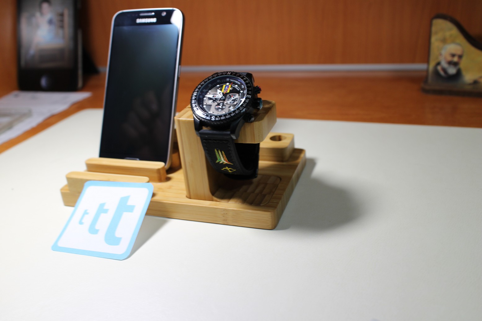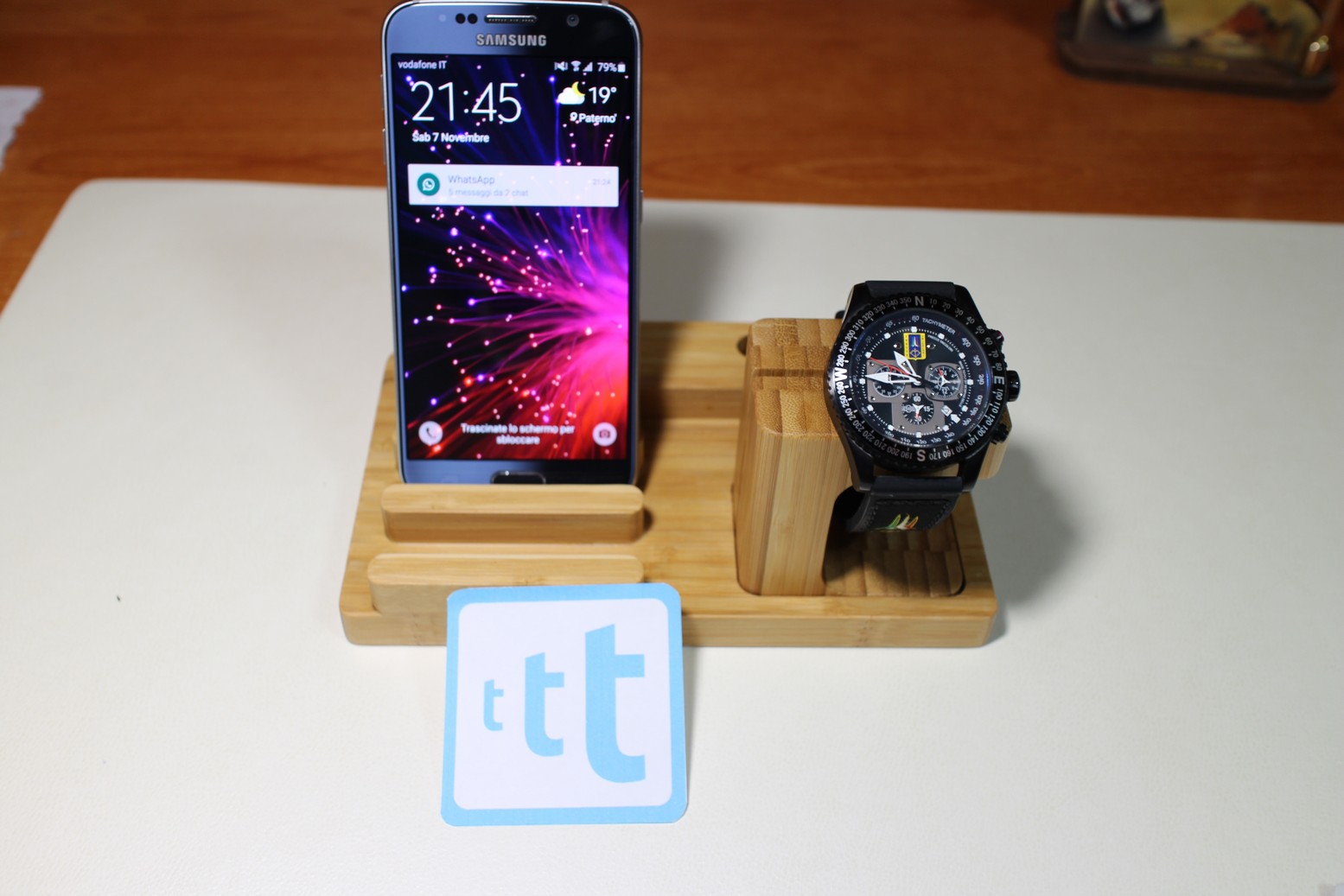 COSTRUZIONE Come accennato, interamente in legno, ben rifinito e lucido con tante venature che lo rendono veramente adatto ad ogni ambiente. Gommato sia nel fondo per non graffiare i nostri mobili, sia ove si andrà a poggiare lo smartphone. La parte dello stand dedicata ad Apple Watch è removibile ed è possibile passare il cavo ed integrare la ricarica dello smartwatch di Cupertino direttamente nello stand. Purtroppo non ci sono invece fori o connettori per ricaricare lo smartphone.