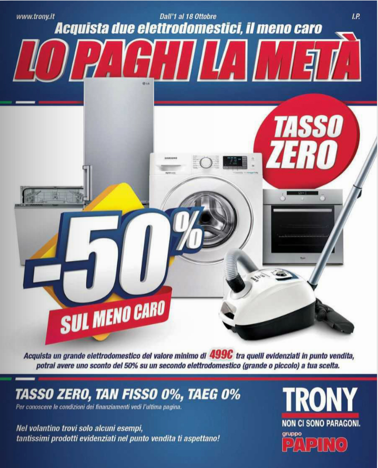 Dall’1 al 18 Ottobre, torna la promozione Trony “il meno caro lo paghi la metà”. La promozione è legata agli elettrodomestici, quindi, purtroppo, non è relativa al resto del reparto di tecnologia in generale.