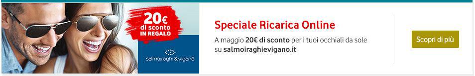 Per richiedere il premio Vodafone basterà effettuare una ricarica online nel mese di Maggio. Il buono consiste in uno sconto vero e proprio di 20€ per gli occhiali acquistabili nel sito stesso salmoiraghievigano.it.