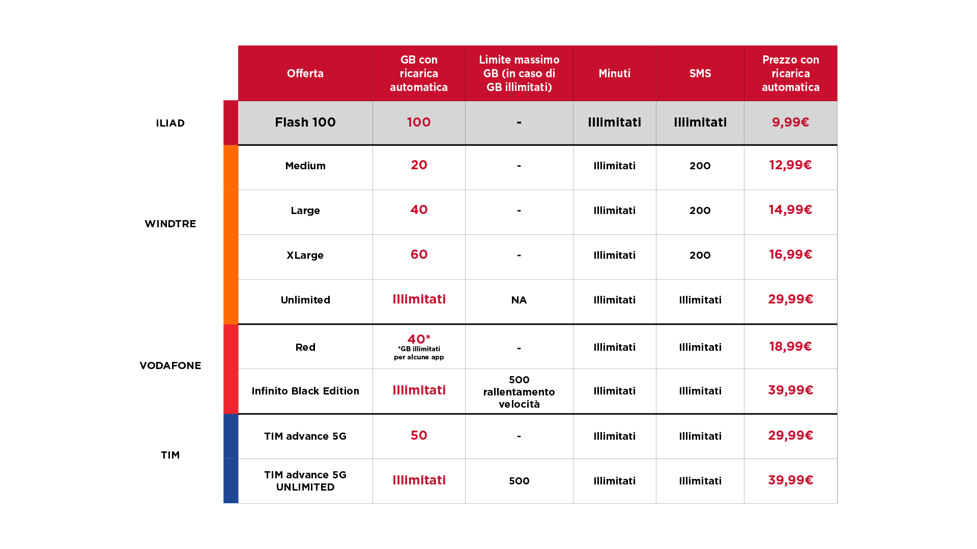 Tabella di comparazione tra offerte degli operatori di rete mobile che includono un pacchetto con Minuti, SMS e GB senza limiti di velocità e disponibili per nuovi utenti e utenti provenienti da ogni operatore al 15/09/2020.