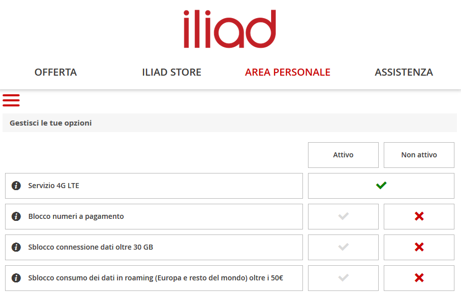Iliad ha finalmente ascoltato i suggerimenti dei suoi utenti introducendo il blocco della navigazione internet raggiunti i 30GB, predisponendo anche il blocco dei consumi all’estero nel caso la spesa dovesse superare i 50€. Queste funzioni sono attive a tutti per default: si dovrà mettere mano alle impostazioni nell’area personale solo se si vuole togliere i suddetti blocchi.