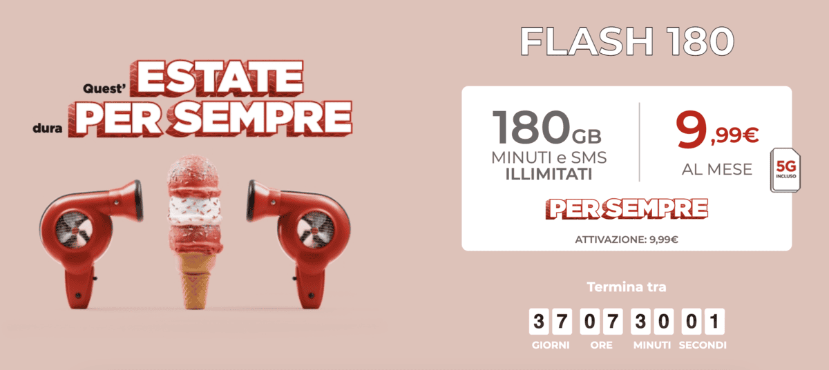iliad ha lanciato oggi FLASH 180, una nuova offerta attivabile entro il 14 Settembre che include anche il 5G con quello che è il canone mensile più basso in assoluto per un’offerta 5G se si considerano i gestori non virtuali. FLASH 180 di iliad offre infatti la solita garanzia iliad di prezzo bloccato per sempre, minuti ed SMS illimitati e 180GB in 5G a 9.99€ al mese.