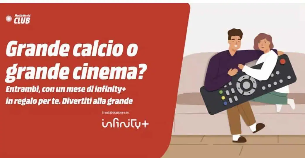 Gli iscritti o coloro che si iscriveranno gratuitamente al programma fedeltà MediaWorld CLUB durante il mese di Settembre 2023 riceveranno in omaggio un interessante codice promozionale per attivare un mese gratis di Infinity+, l’abbonamento Mediaset che include contenuti esclusivi come match di UEFA Champions League e il grande cinema.