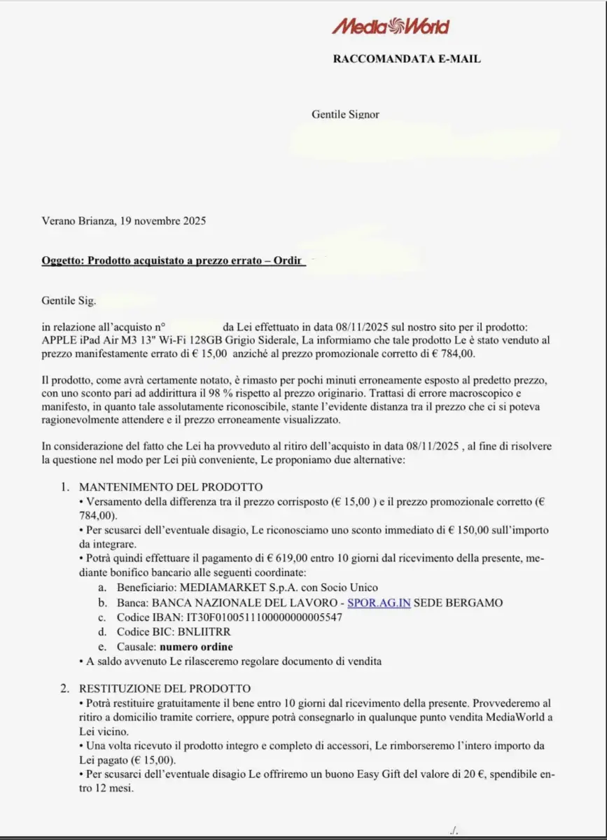 iPad M3 da 13″ venduto a 15€ da MediaWorld che adesso contatta i clienti e ne chiede la restituzione: come stanno le cose? cosa abbiamo fatto noi?