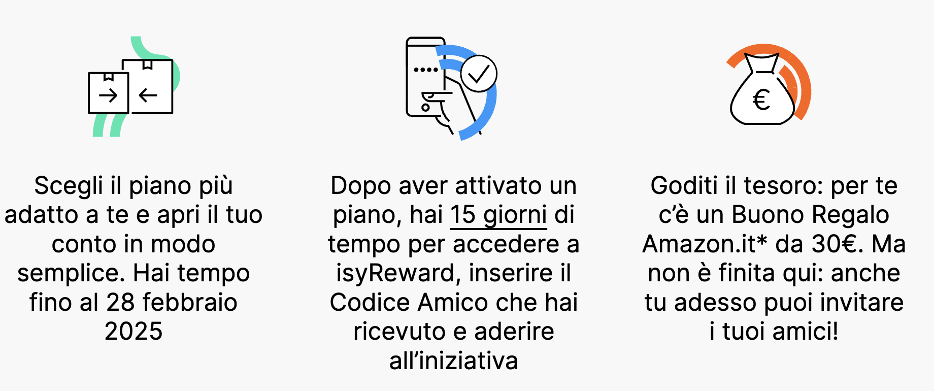 - Non appena aperto il conto e non oltre i 15 giorni, accedi al menu in app isyReward (…Altro -> IsyReward) e inserisci il codice OKPHYC1JKN – ⚡️ ATTENZIONE, passaggio fondamentale per ricevere i 30€ – il codice va inserito DOPO l’apertura;