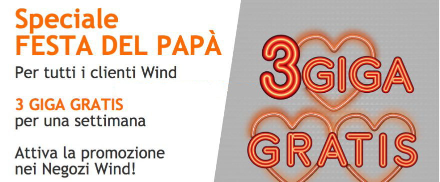 Wind, in occasione della festa del papà, decide di omaggiare i propri clienti con 3GB di traffico dati per una settimana. La promozione, denominata Cogli un attimo 3 GIGA, potrà essere attivata da tutti i clienti ricaricabili dell’operatore a partire da oggi, 13 marzo 2017, fino al 19 marzo presso uno dei rivenditori Wind. Dopo 7 giorni dal momento dell’attivazione, l’offerta si disattiverà automaticamente.