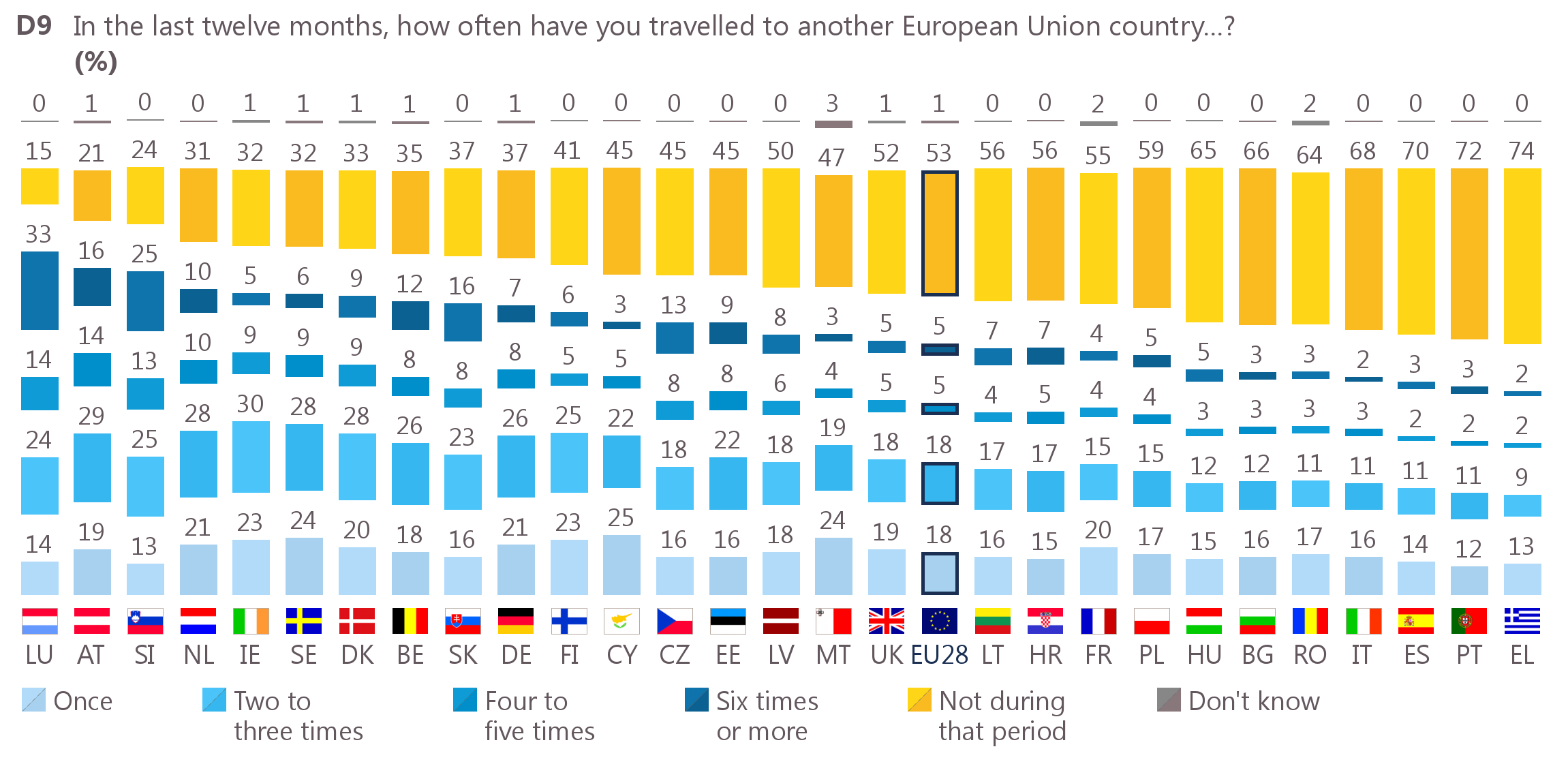 La dimenticanza è in parte giustificata una volta confrontata con i dati relativi ai viaggi all’estero: italiani, portoghesi e greci sono quelli che hanno viaggiato meno nell’ultimo anno. Lussemburgo, Austria e Slovenia compaiono sul podio di entrambe le parti del sondaggio.
