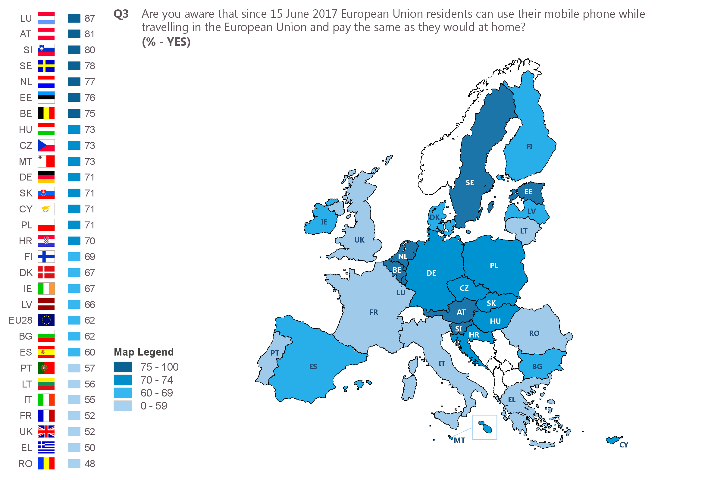Secondo i dati emersi da un sondaggio europeo pubblicato questo mese, solo il 62% degli europei è al corrente dell’azzeramento dei costi di roaming nell’Unione. L’Italia si piazza con il suo 55% tra gli ultimi posti in classifica, seguita solo da Francia, Regno Unito, Grecia e Romania.