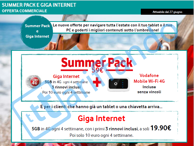 • Summer Pack costerà 59€ ed includerà Giga Internet ai prezzi indicati prima e Vodafone Mobile Wi-Fi 4G Incluso senza vincoli di nessun tipo.