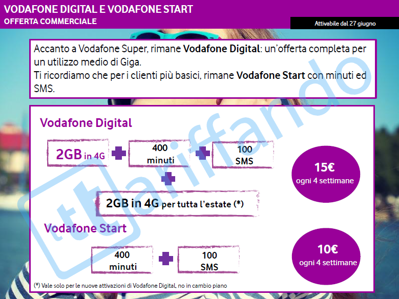 • Vodafone Digital include invece 2GB in 4G, 400 Minuti e 100 SMS a 15€ ogni 4 settimane, con ulteriori 2GB in omaggio ogni rinnovo per tutta l’estate.vodafone_digital