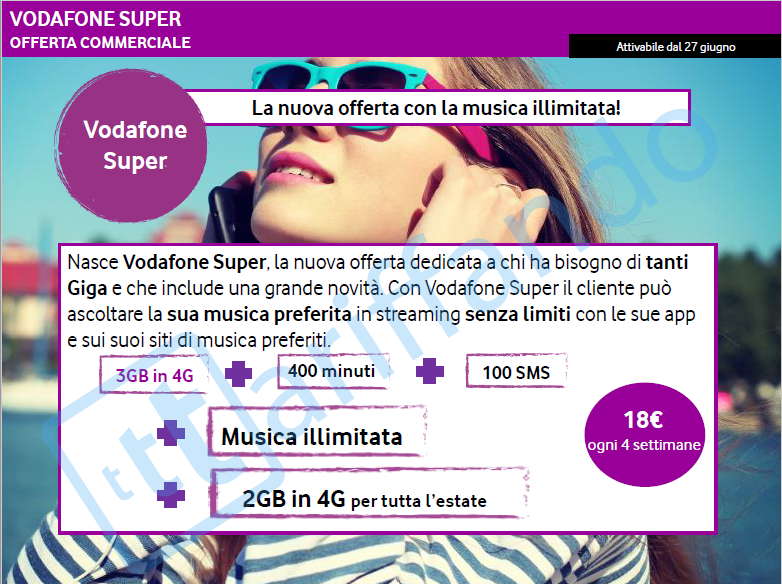 • Vodafone Super è la nuova offerta dedicata a chi ha bisogno di tanti Giga con cui si  può ascoltare la  musica preferita in streaming senza limiti con le sue app e sui suoi siti di musica preferiti. Attivabile dal 27 giugno Vodafone Super offre  3GB in 4G, 400 minuti e 100 SMS a 18€ ogni 4 settimane – per tutta l’estate ci sono ulteriori 2GB ogni rinnovo inclusi in forma gratuita.
