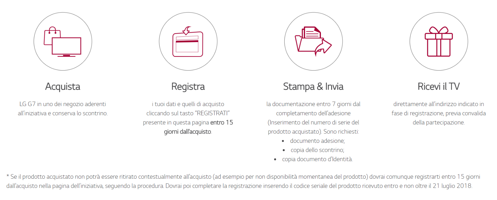Se il prodotto acquistato non potrà essere ritirato subito dopo all’acquisto, è comunque richiesta la registrazione entro 15 giorni dall’acquisto nella pagina dell’iniziativa, seguendo la procedura. Si dovrà poi completare la registrazione inserendo il codice seriale del prodotto ricevuto entro e non oltre il 21 luglio 2018.